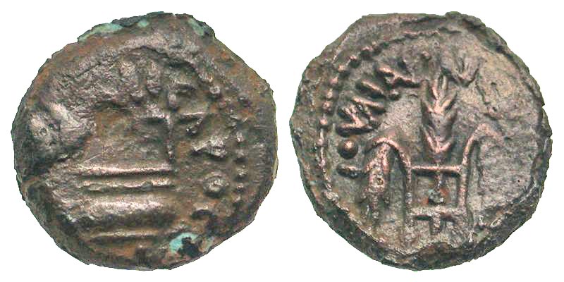 Lot 51-080. Judaea, Procurators. Pontius Pilate. 26-36 C.E. AE prutah. Jerusalem mint, Prefect under Tiberius, dated year 16 = 29/30 C.E..