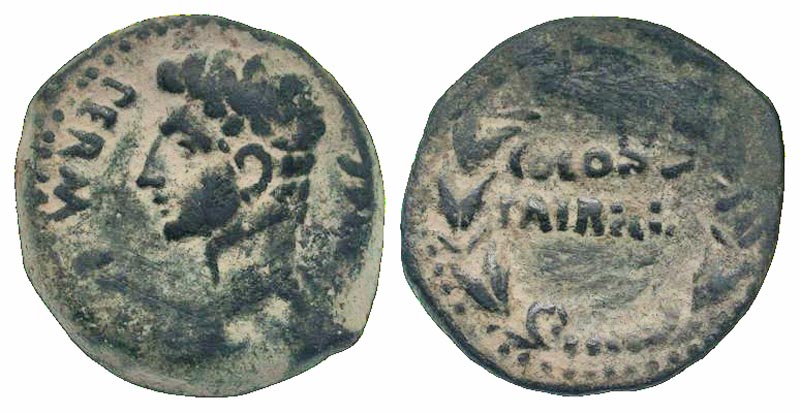 Hispania, Colonia Patricia. Augustus. 27 B.C.-A.D. 14 AE as (26.8 mm, 10.50 g, 6 h). PERM CAES AVG, bare head of Augustus left / COLONIA PATRICIA, legend within oak wreath. RPC 129; ACIP 3357. aVF, sandy patina.