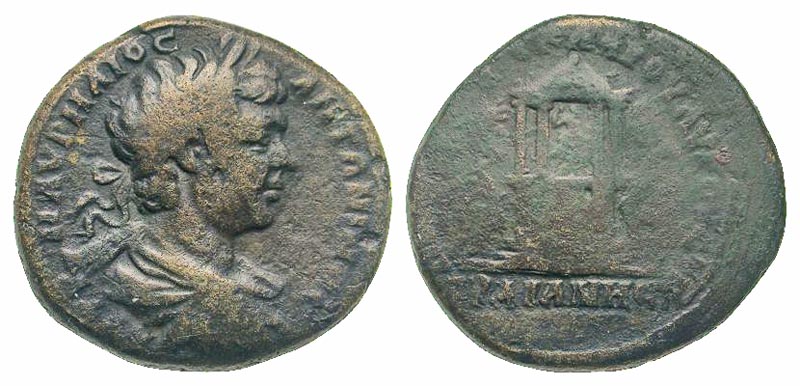 Thrace, Augusta Traiana. Caracalla. A.D. 198-217. AE 31 (30.5 mm, 15.94 g, 1 h). AVT K M AVPHΛIC ANTΩNEINOC, laureate, draped, and cuirassed bust right / HΓ CIKINNIOV KΛAPOV AVΓOVCTHC TPAIANHC, temple of Artemis or raised platform between two trees. Varbanov 1252; Schoenert-Geiss 233. Fine. Scarce.