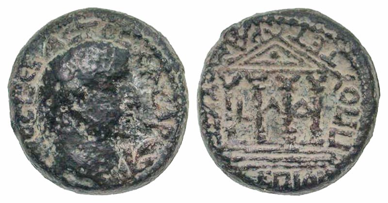 Judaea, Herodian Dynasty. Caesarea Philippi. Tiberius with Herod Philip. A.D. 14-37. AE 19 (18.6 mm, 6.43 g, 11 h). Dated RY 34 of Herod Philip (30/1 C.E.). TIBEPIOY ΣEBAΣTOΣ KAIΣAP, bare head of Tiberius right; laurel branch to right / ΦΙΛΙΠΠΟΥ TETPAPXOY KTIΣ, the Augusteum of Panaeas; LΛΔ between columns. RPC 4948; Hendin 1230; Meshorer TJC 106. aVF/EF, sandy patina.