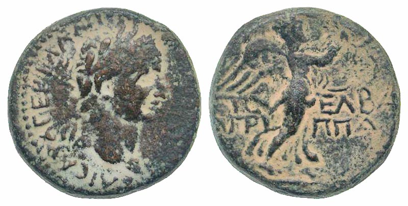 Judaea, Herodian Dynasty. Caesarea Paneas. Domitian with Agrippa II. A.D. 81-96. AE 23 (22.9 mm, 11.79 g, 12 h). Dated year 35 (94/5 C.E.). AYTOKPA ΔOMITIA KAICAPA ΓEPMANI, laureate head right / ETOY EΛBA / AΓPIΠΠ, Victory advancing right, holding wreath and palm. RPC 2297; Hendin 1299; Meshorer 54. VF, sandy patina.