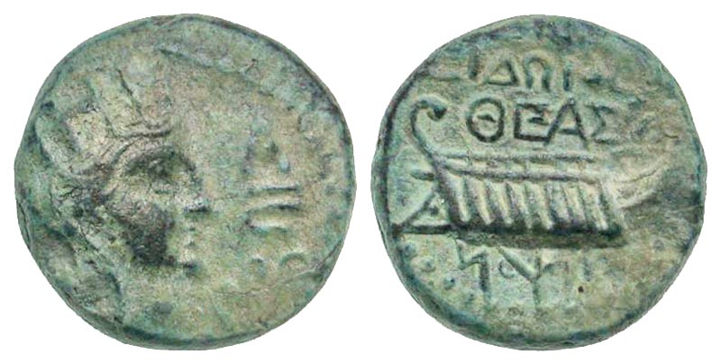 Phoenicia, Sidon. Civic Issue. 1st Century A.D. AE 16 (15.8 mm, 3.08 g, 1 h). Struck A.D. 44-45. Turreted bust of Tyche right; A, digamma, and aphlaston before / ENP ΣIΔΩNOΣ ΘEAΣ, war-galley left, Phoenician legend below. RPC 4588; BMC 171; SNG Cop 239. VF, soft green patina.