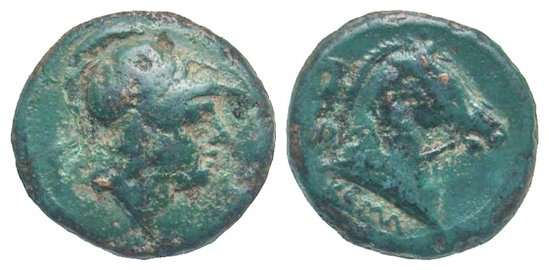 Anonymous [Sickle]. Ca. 241-235 B.C. AE litra (16.2 mm, 2.55 g, 5 h). Rome mint. Helmeted head of Mars right / ROMA, Horsehead right; sickle behind. Crawford 25/3; Sydenham 26. Fine, blue-green patina, pitted.