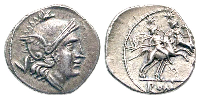 Anonymous. ca. 211-210 B.C. AR quinarius (17.1 mm, 2.23 g, 11 h). Mint in Apulia. Helmeted head of Roma right, wearing Attic helmet; V behind / ROMA, the Dioscuri riding right, each holds a spear, star above each. Crawford 102/2b; Sydenham 141a var. ; RSC 33i var. (same). gVF, off center reverse. Rare.