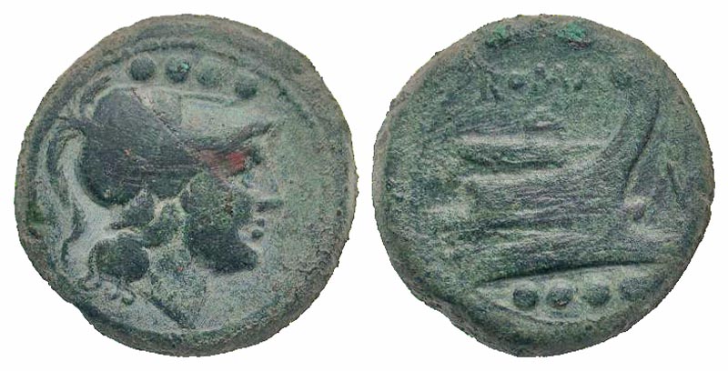 Anonymous [V]. Ca. 211-210 B.C. AE triens (24.0 mm, 11.27 g, 10 h). Southeast Italian mint. Helmeted head of Minerva right; four pellets above / ROMA, prow of galley right; four pellets below, V to right. Crawford 87/3; Sydenham 186b. aVF, soft blue-green patina.