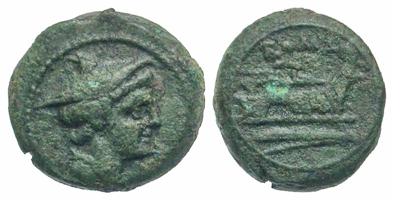 Anonymous. after 211 B.C. AE semuncia (15.1 mm, 2.91 g, 10 h). Sextanal standard. Rome mint. Head of Mercury right, wearing winged petasus / ROMA, prow of galley right. Crawford 56/8; Sydenham 143f. VF, olive green patina. Very Rare.