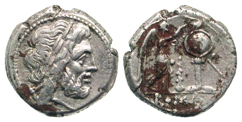 Anonymous [Club]. Ca. 208 B.C. AR fourrée victoriatus (17.2 mm, 3.42 g, 12 h). Southeastern Italian mint. Laureate head of Jupiter right / ROMA in exergue, Victory standing right, crowning trophy with wreath; club between them. Crawford 98/1a; Sydenham 212; RSC 24b. VF.