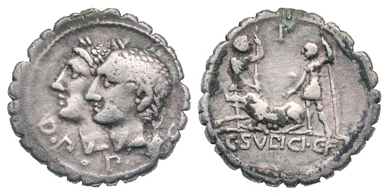 C. Sulpicius C.f. Galba. 106 B.C. AR serrate denarius (19.1 mm, 3.79 g, 11 h). Rome mint. D·P·P·, conjoined laureate heads of the Dei Penates left / C·SVLPICI·C·F, two soldiers standing facing one another, each holding spear and pointing at a sow which lays between them, I above. Crawford 312/1; Sydenham 572; RSC Sulpicia 1. aVF19.0, 3.75. 1.