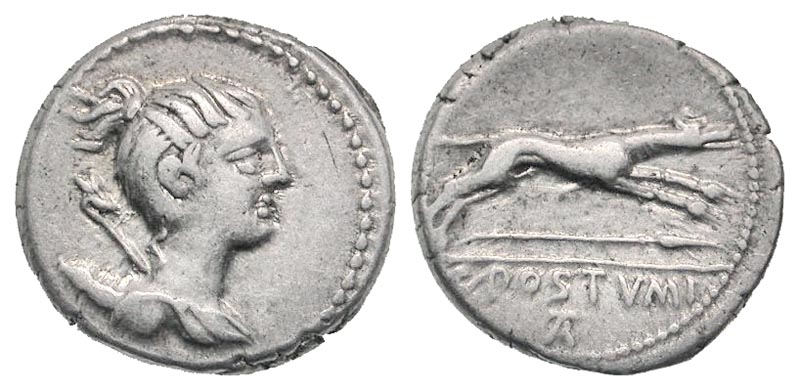 C. Postumius At? or Ta?. 73 B.C. AR denarius (18.5 mm, 4.11 g, 5 h). Rome mint. Bust of Diana right, bow and quiver on shoulder / C·POSTVMI, hound running right, spear below; AT monogram in exergue. Crawford 394/1a; Sydenham 785; RSC Postumia 9. VF.