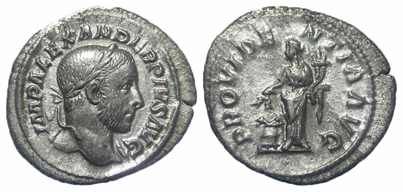 Severus Alexander. A.D. 222-235. AR denarius (21.2 mm, 2.88 g, 7 h). Rome, A.D. 232. IMP ALEXANDER PIVS AVG, laureate bust right, draped left shoulder / PROVIDENTIA AVG, Providentia standing left, holding grain ears over modius, and holding cornucopia . RIC 250; RSC 501b; BMCRE 875. gFine.