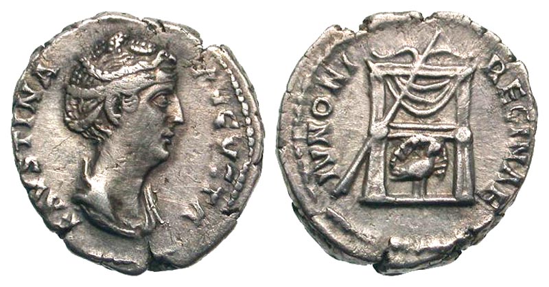 Faustina I. Augusta, A.D. 138-140/1. AR denarius (18.2 mm, 3.17 g, 6 h). Rome mint, struck ca. A.D. 146-161. FAVSTINA AVGVSTA, draped bust right, with strings of pearls in hair / IVNONI REGINAE, draped throne; transverse scepter resting against arm, peacock with spread tail standing to right below. RIC 339a (A. Pius); BMCRE 139; RSC 219. aVF. Scarce.