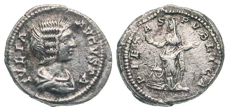 Julia Domna. Augusta, A.D. 193-217. AR denarius (19.5 mm, 2.77 g, 5 h). Rome mint, struck A.D. 203. IVLIA AVGVSTA, draped bust right / PIETAS PVBLICA, Pietas standing left, raising both hands, altar at feet left. RIC 574; RSC 156; BMCRE 69. VF.