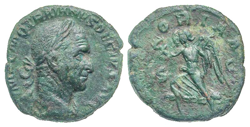 Trajan Decius. A.D. 249-251. AE as (27.3 mm, 12.61 g, 12 h). Rome mint. IMP C M Q TRAIANVS DECIVS AVG, laureate and cuirassed bust right / VICTORIA AVG, S-C, Victory advancing left, holding wreath and palm. RIC 108b var (obv legend). aVF.