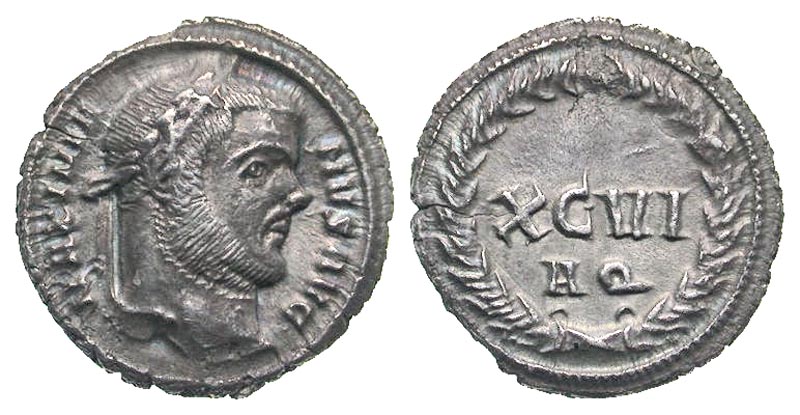Maximianus. First reign, A.D. 286-305. AR argenteus (19.8 mm, 3.04 g, 5 h). Aquileia mint, struck A.D. 300. MAXIMIANVS AVG, laureate head right / XCVI, AQ, legend and mintmark within wreath. RIC 16b; RSC 697. gVF.