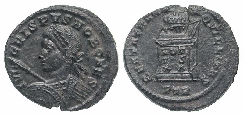 Lot 51-199. Crispus. Caesar, A.D. 317-326. AE 3. Treveri mint, struck A.D. 317-326. Ex Elwood Rafn collection. Unlisted legend break.