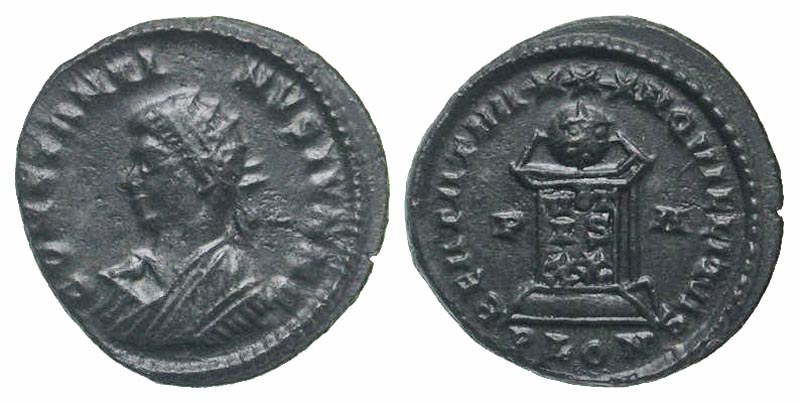 Constantine II. As Caesar, A.D. 317-337. AE follis (19 mm, 2.91 g, 5 h). London mint, struck A.D. 321. CONSTANTI-NVS IVN N C, radiate, draped and cuirassed bust left / BEATA TRA-NQILLITAS, globe set on altar inscribed VOT/IS/XX in three lines; above, three stars; P-A//PLON. RIC -, but cf. 216 (BEAT). VF, black patina. Unrecorded variety.