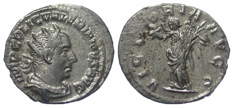 Valerian I. A.D. 253-260. AR antoninianus (22.1 mm, 2.97 g, 1 h). Rome, A.D. 253-254. IMP C P LIC VALERIANVS AVG, radiate, draped and cuirassed bust right / VICTORIA AVGG, Victory standing left, holding wreath and palm. RIC 125; RSC 230; Göbl 30d. VF, fully silvered.