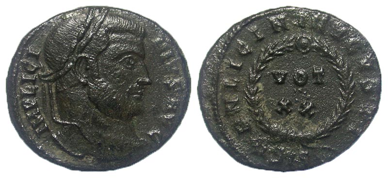 Licinius I. A.D. 308-324. Æ 3 (19.0 mm, 2.93 g, 7 h). Siscia, A.D. 318-319. IMP LICINIVS AVG, laureate head right / D N LICINI AVGVSTI, legend around VOT/·/XX; BSIS in exe. RIC 150. Fine.