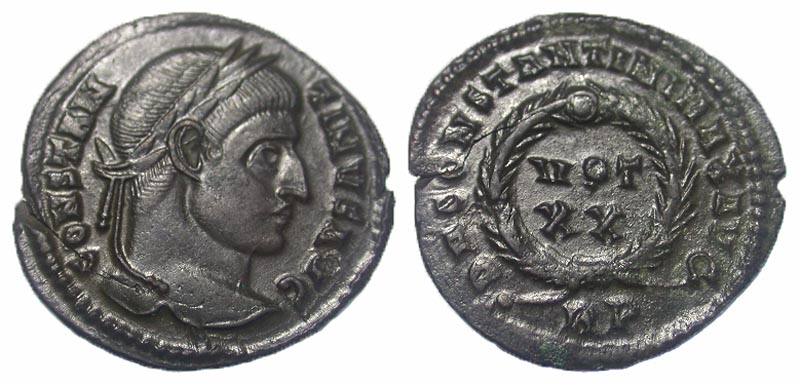 Constantine I. A.D. 307/10-337. Æ 3 (20.1 mm, 2.78 g, 7 h). Rome, A.D. 321. CONSTANTINVS AVG, laureate head right / D N CONSTANTINI MAX around VOT XX within wreath; RP in exe. RIC 232. gVF.
