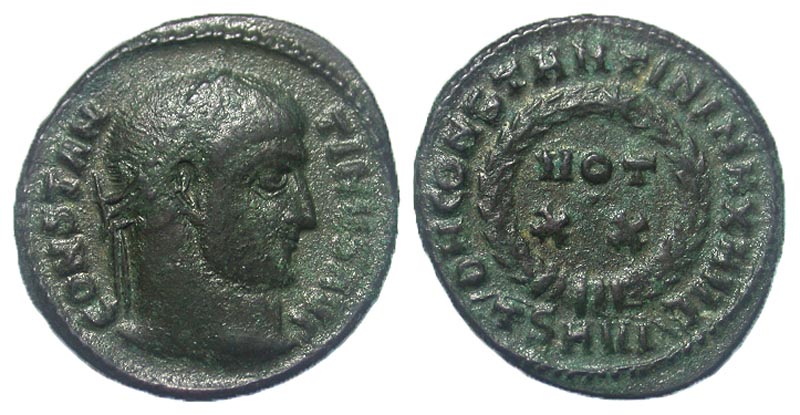Constantine I. A.D. 307/10-337. Æ 3 (19.2 mm, 2.89 g, 6 h). Thessalonica, A.D. 320-324. CONSTANTINVS AVG, laureate head right / D N CONSTANTINI MAX AVG, legend around VOT/XX; TSAVI in exe. RIC 101/123. VF, blue-green patina.