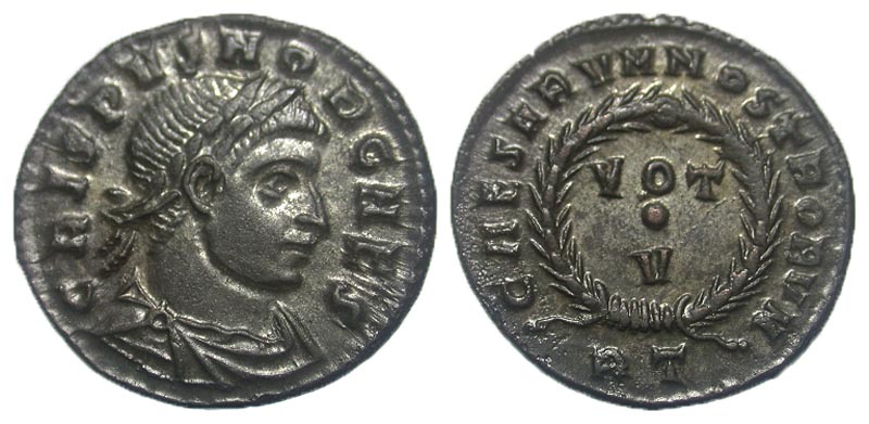Crispus. Caesar, A.D. 317-326. Æ 3 (19.6 mm, 3.11 g, 11 h). Rome, A.D. 321. CRISPVS NOB CAES, laureate, draped and cuirassed bust right / CAESARVM NOSTRORVM around VOT V within wreath; RT in exe. RIC 229. gVF, partially silvered.