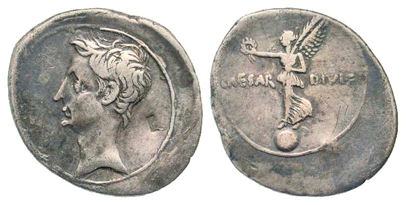 Octavian. 44-27 B.C. AR denarius (23.1 mm, 3.51 g, 6 h). Italian (Rome?) mint, Autumn 31- summer 30 B.C. Laureate head of Octavian left / CAESAR - DIVI F, Victory standing to left on globe and holding wreath in extended right hand and shouldering palm branch with left hand. RIC 254b; RSC 64; CRI 407. VF, toned, clear, sharp portrait of Octavian; bankers mark. Ex D. Thomas Collection. This coin is part of the series issued to commemorate Octavian's victory over Mark Antony and Cleopatra at Actium.The Battle of Actium was the decisive confrontation of the final war of the Roman Republic, a naval engagement between Octavian's fleet and the combined forces of Mark Antony and Cleopatra on 2 September 31 BC, on the Ionian Sea near the city of Actium. Octavian's fleet was commanded by Marcus Vipsanius Agrippa.