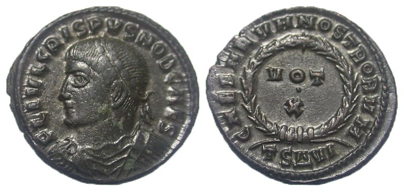 Crispus. Caesar, A.D. 317-326. Æ 3 (18.5 mm, 3.18 g, 11 h). Thessalonica, A.D. 324. FL IVL CRISPVS NOB CAES, laureate, draped and cuirassed bust left / CAESARVM NOSTRORVM around VOT X within wreath; TSΔVI in exe. RIC 98. gVF.