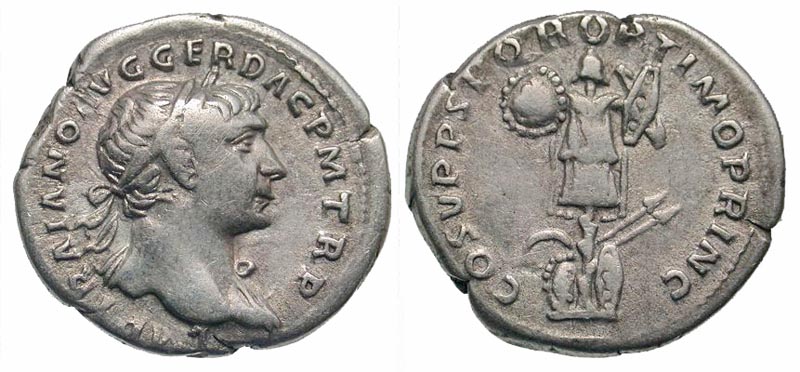 Lot 52-178. Trajan. A.D. 98-117. AR denarius. Rome mint, struck A.D. 107-111.