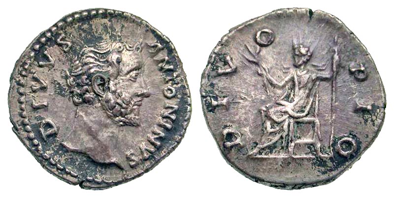 Divus Antoninus Pius. Died A.D. 161. AR denarius (18.5 mm, 3.33 g, 5 h). Rome mint, under Marcus Aurelius and Lucius Verus, A.D. 162. DIVVS ANTONINVS, bare head right, slight drapery / DIVO PIO, Antoninus Pius seated left, holding branch and scepter. RIC 442; BMC 65; RSC 352. Nice VF, lightly toned.