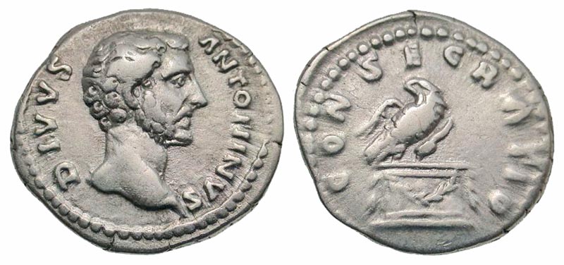 Lot 52-190. Divus Antoninus Pius. Died A.D. 161. AR denarius. Rome mint, struck A.D. 161.