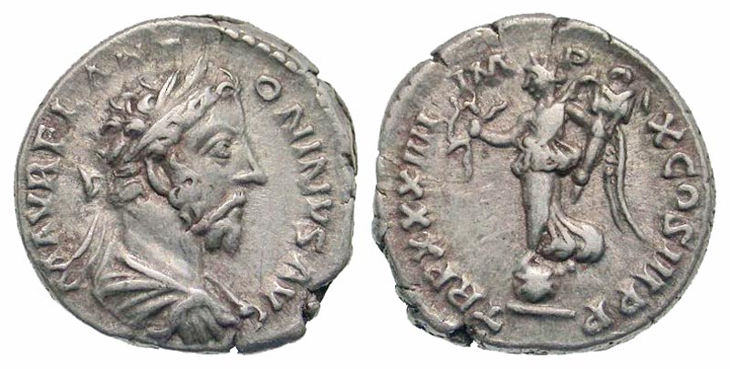 Lot 52-194. Marcus Aurelius. A.D. 161-180. AR denarius. Rome mint, struck A.D. 178. Rare.