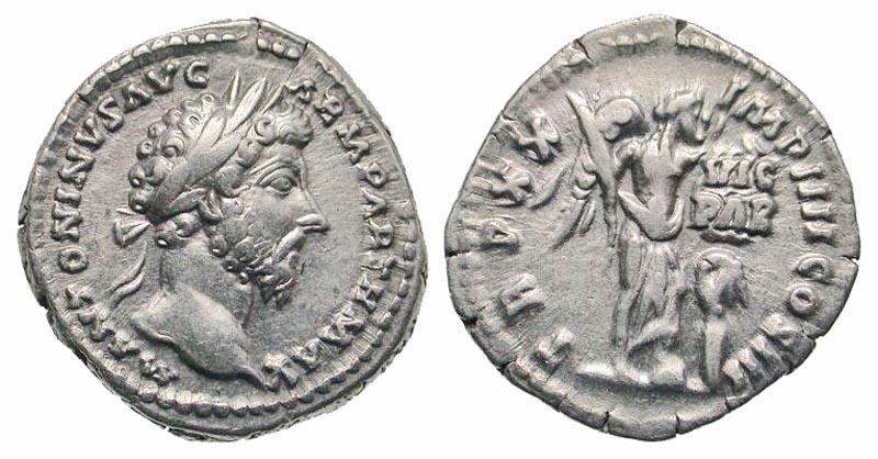 The Roman-Parthian war raged from A.D. 161 to 166, when Marcus Aurelius and Lucius Verus successfully defeated the Parthian capital of Ctesiphon. This coin was struck in the final year of that war to commemorate their ultimate victory over the Parthians. Although the Parthian empire was never taken by the Romans, this battle helped to end the grandeur of this eastern empire. There were several more battles between the Romans and Parthians along this same territory, but the Parthian empire eventually succumbed to the Sasanians in A.D. 228, thus ensuing another bloody rivalry between Rome and the east.