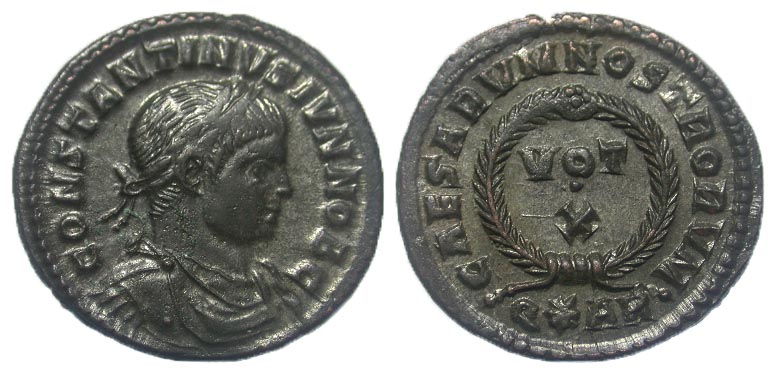 Constantine II. As Caesar, A.D. 317-337. Æ 3 (19.4 mm, 3.01 g, 12 h). Arles, A.D. 322-323. CONSTANTINVS IVN NOB C, laureate, draped and cuirassed bust right / CAESARVM NOSTRORVM around VOT X in two lines within wreath; Q*AR in exe. RIC 261. gVF, Fully silvered.