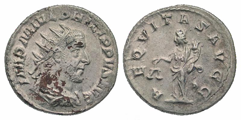 Philip I. A.D. 244-249. AR antoninianus (21.0 mm, 4.74 g, 6 h). Antioch mint, struck A.D. 247-249. IMP M IVL PHILIPPVS AVG, radiate cuirassed bust left / AEQVITAS AVGG, Aequitas standing left, holding scales and cornucopia. RIC 82; RSC 8. VF, small red encrustations on the obverse.