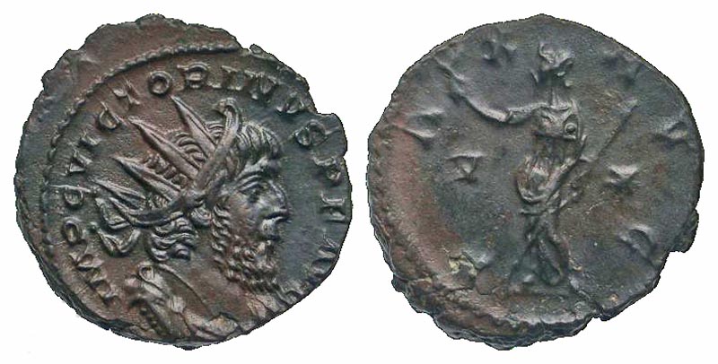 Victorinus. Romano-Gallic Emperor, A.D. 269-271. AE antoninianus (19.3 mm, 3.19 g, 7 h). Treveri mint, struck A.D. 270. IMP C VICTORINVS P F AVG, radiate, draped, and cuirassed bust right / PA-X AVG, Pax standing left, holding olive branch and transverse scepter; V-* in fields. RIC 118; Mairat 261-3; AGK 14b. EF, dark brown patina.