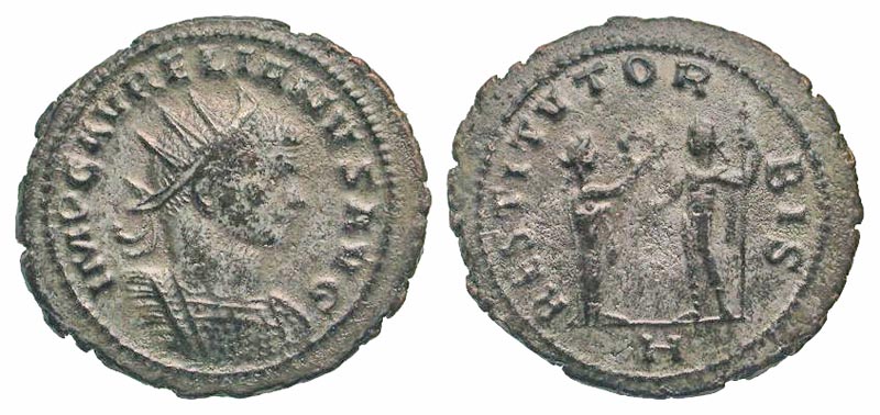 Aurelian. A.D. 270-275. AE antoninianus (24.2 mm, 4.21 g, 6 h). Antioch mint, struck A.D. 272-273. IMP C AVRELIANVS AVG, radiate and cuirassed bust right / RESTITVT ORBIS, Female standing right, presenting wreath to Aurelian standing left, holding scepter; H in exergue. RIC 386. Choice EF, fully silvered.