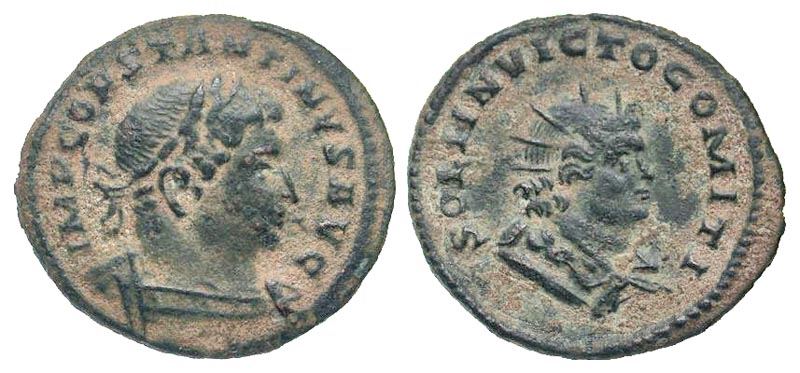 Constantine I. A.D. 307/10-337. AE follis (23.7 mm, 3.38 g, 11 h). Treveri mint, struck A.D. 310-311. IMP CONSTANTINVS AVG, laureate and cuirassed bust right / SOLI INVICTO COMITI, radiate and draped bust of Sol right. RIC 890. VF, sandy patina.