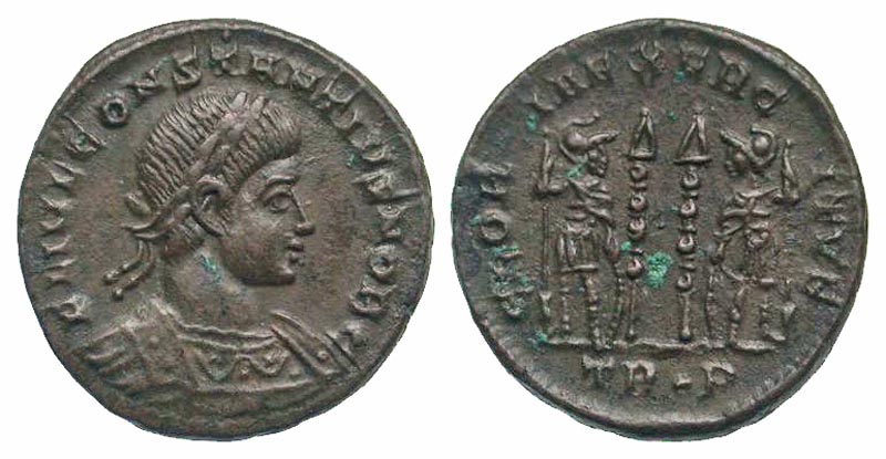 Constantius II. As Caesar, A.D. 324-337. AE 3 (17.0 mm, 2.35 g, 12 h). Trier mint, struck A.D. 332-333. FL IVL CONSTANTIVS NOB C, laureate and cuirassed bust right / GLORIA EXERCITVS, two soldiers, holding spears, standing front, heads turned inward, hand on shield, two standards between them; TR·P in exergue. RIC 540; LRBC 63. gVF.