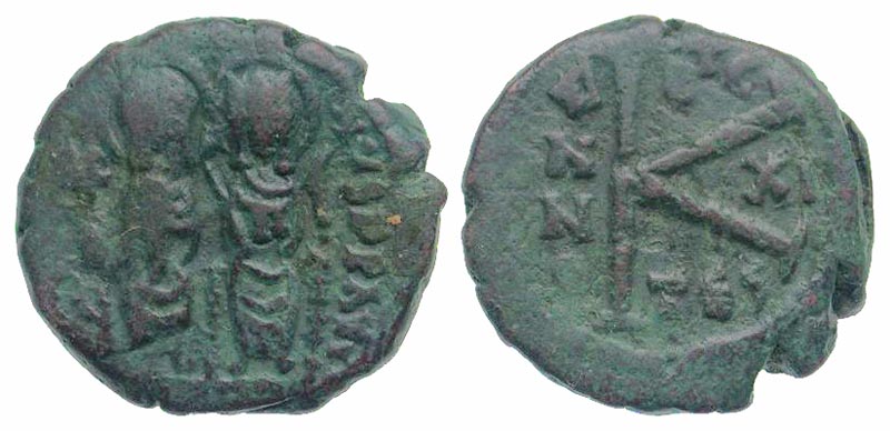 Lot 52-256. Justin II. 565-578. AE half follis. Thessalonica mint, struck 575/576.