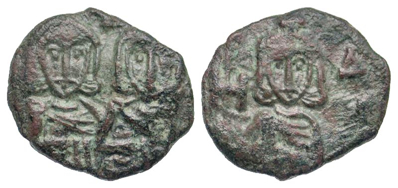 Constantine V Copronymus. 741-775. AE follis (18.7 mm, 2.63 g, 5 h). Syracuse mint. ΛEΩN, Constantine V, bearded on left, and Leo IV, beardless on right, standing facing, each wearing crown and chlamys and holding akakia; cross between their heads / ΛEON-ΔECΠ, Leo III, bearded, half-length, standing facing, wearing crown and chlamys and holding cross potent. SBV 1569; DOC 19. VF.