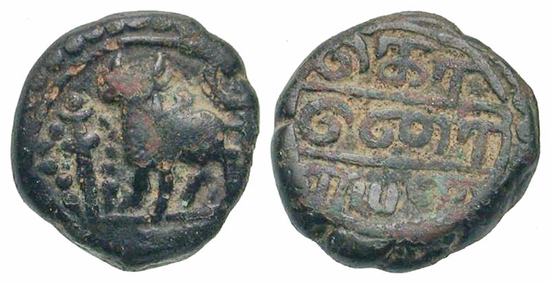 South India, Vijayanagara Empire. Shri Vijayanagar Feudatories , Koneri Rayan. 1487-1512. CU jital (15.2 mm, 3.29 g, 4 h). Bull standing left, facing dagger, sun and moon above / Three-line Tamil legend: ko / ne ri / ra yan. MNI 1158, Ganesh Coins of Tamilnadu, 13.1. aVF.