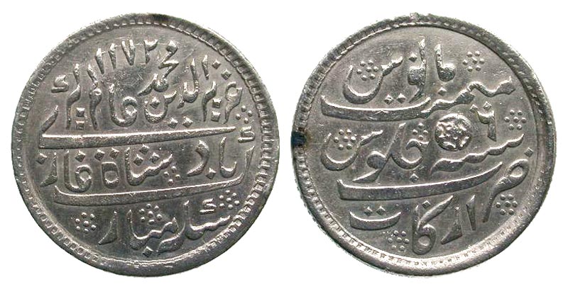 Lot 52-278. East India Company, Madras Presidency. In the name of Mughal emperor Aziz al-Din Alamgir II, 1754-1759. 1832-1835. AR rupee. Arkat mint; rose mintmark, frozen date of A.H. 1172, Year 6, struck 1823-1835.