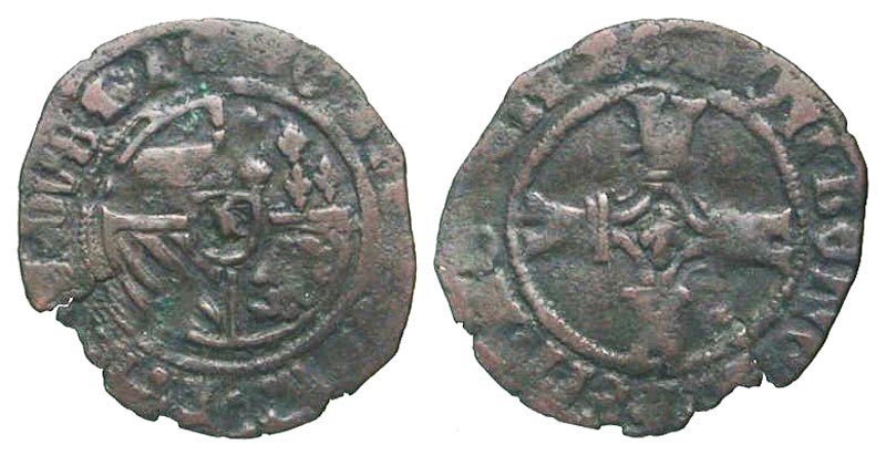Low Countries, Flanders. Karel de Stoute (the Bold). 1467-1477. AR double myt (19.2 mm, 0.73 g, 6 h). Brugge mint. Coat of arms / Long cross with lily at center, four lilies in field around. De May 645; D.d.P., 1,9. Fine.