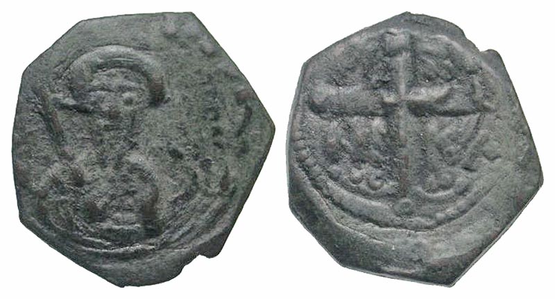 Crusader States, Principality of Antioch. Tancred. Regent for Bohemond of Otranto, A.D. 1104-1112. AE follis (21.9 mm, 3.95 g, 5 h). Second type. [KE BOHΘH TΩ ΔOVΛΩ TANKPI], bearded and turbaned bust of Tancred facing in chain mail, holding sword / Cross pommetée, fleuronnée at base; [IC-XC]/ NI-KA across field and in quadrants of cross. Metcalf 44; Schlumberger Pl II, 7. Crude Fine.