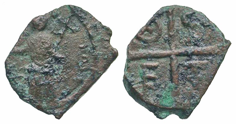 Crusader States, Principality of Antioch. Tancred. Regent for captured Bohemond I, 1104-1112 A.D.. AE follis (19.2 mm, 2.39 g, 4 h). Third type. St. Peter standing facing, raising hand in benediction and holding long cross / Cross; D-S-E-T in quarters. Metcalf, Crusades 71; CCS 6 var. (D-S-F-T). Crude Fine, struck on a small flan.