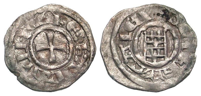 Crusader States, Latin Kingdom of Jerusalem. Baldwin III. 1143-1163. BI obol (13.4 mm, 0.50 g, 12 h). 'Smooth' coinage, group 5(?). BALdVINVS RЄX, cross pattée / +dEIЄRVSALЄM, tower of David. Malloy 21 var; Metcalf 154. aVF.