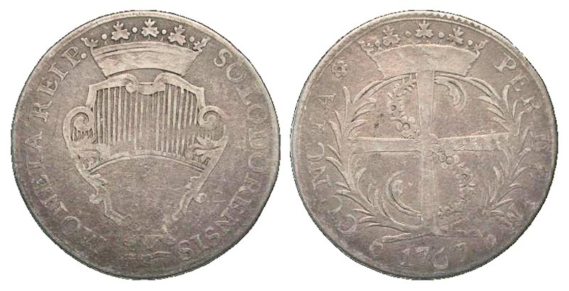 Swiss Cantons, Solothurn. 1767. AR 10 batzen (30.7 mm, 7.71 g, 7 h). Crowned shield / Crowned floral S on cross within wreath. HMZ 845e. VF, toned.