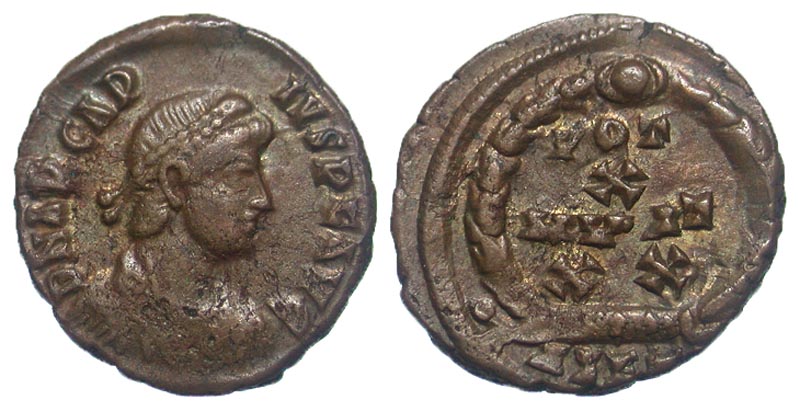 Arcadius. A.D. 383-408. Æ 4 (14.0 mm, 1.10 g, 5 h). Antioch, A.D. 383. DN ARCADIVS PF AVG, pearl-diademed, draped and cuirassed bust right / VOT X MVLT XX, legend within wreath; ANT? in exe. RIC 65c; LRBC 2735. VF, cleaned.