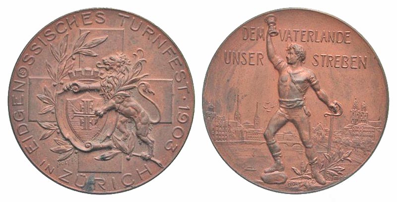 Switzerland, Zurich. 1903. AE gymnastics medal (36 mm, 28.21 g, 12 h). Federal Gymnastics Festival in Zurich, 18-21 July 1903. By the Holy Frères. EIDGENÖSSISCHES TURNFEST · 1903/ IN ZÜRICH, crowned arms over Swiss cross and branch with winged rampant lion / VATERLANDE/UNSER STREBEN, gymnast standing left before cityscape, holding trophy and sword. AU, red-brown.