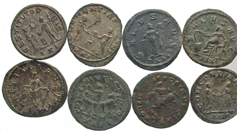 [Roman Imperial]. Lot of 11 Probus Antoninianii. The lot consists of these mints: Antioch, Lugdunum, Rome, Siscia and Ticinum. With these reverse types: silvered Jupiter, silvered Laetitia, Concordia, Felicitas, Germans, Mounted, Pax, Salus seated and standing, Sol and Woman. Average grade aVF-EF.